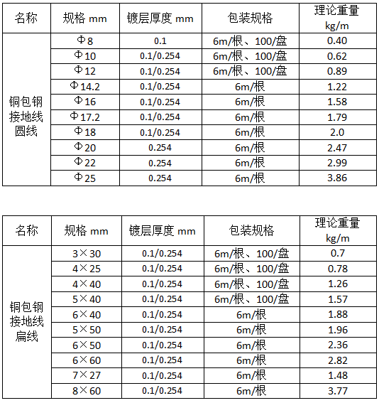 單根銅包鋼接地分圓線和扁線是我公司采用電鍍、連鑄等工藝制作的新型接地體,采用先進的工藝將純度99.9%銅覆蓋至特制鋼芯表面制成,導電性能與同等直徑銅材相同,但造價遠低于純銅,防腐性能遠勝于鍍鋅鋼材,具有導電性能好,低電阻、防腐性能優越、運輸方便、施工方便、施工效率高等諸多優點,是替代圓鋼、角鋼、鍍鋅扁鋼等傳統接地材料的最佳選擇。